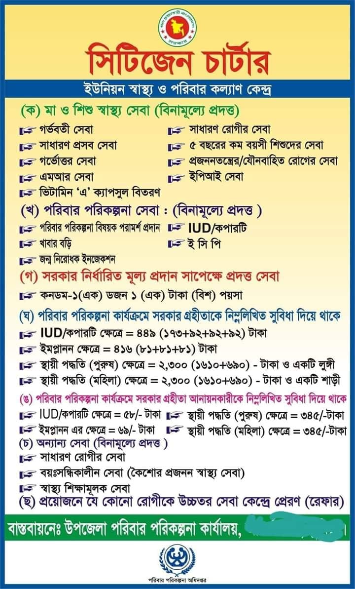 | ০৪ | প:প: পদ্ধতি, খাবার বড়ি, কনডম, ইনজেকশন, কপারটি ইমপ্লেন্ট, ভ্যাসেকটাম।NSV টিউরেকটমি, ই.সি.পি প্রদান পরামর্শ অনুসরন | দম্পত্তি | পরিবার কল্যান পরিদর্শিকা | শনি হতে বৃহষ্প: ৮.৩০ টা হতে ২.৩০ টা | কনডম প্রতিটি ২০ পয়সা | উপজেলা স্বাস্থ্য কমপ্লেক্স প:প: কার্যালয় |